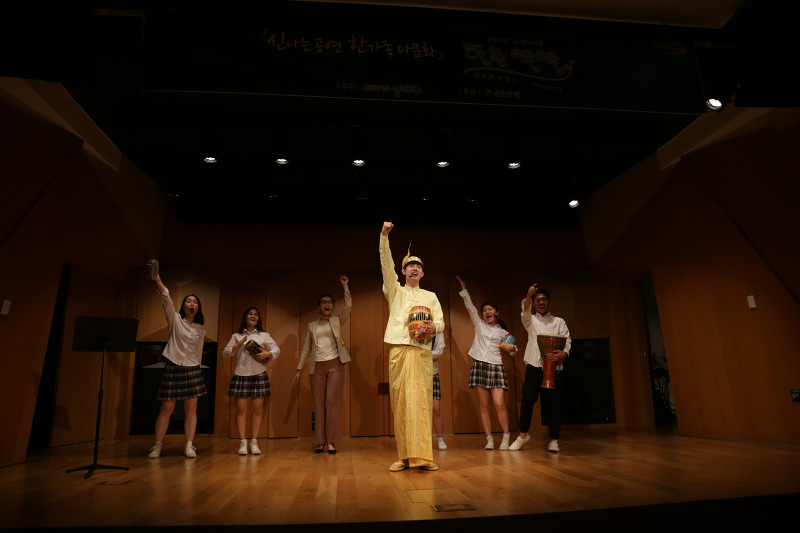 뮤지컬 내용은 몽골 다문화가정의 ‘아라’와 미얀마 이주민 자녀 ‘지민’이 같은 반 친구들과 음악경진대회를 준비하며 겪게 되는 갈등과 화해의 이야기로 우리 주변의 다문화가정 친구들이 ‘다름’이 아닌 ‘하나’라는 메시지를 담고 있다. 작품의 메인 무대가 된 음악실에서는 배우들이 실제로 여러 나라의 악기를 연주했고, 작품이 만들어지는 과정이 자연스럽게 공연에 녹아들었다. 주제가인 미얀마 가요 ‘손에 손잡고’과 미얀마 전통춤이 관객의 감성을 자극한다.