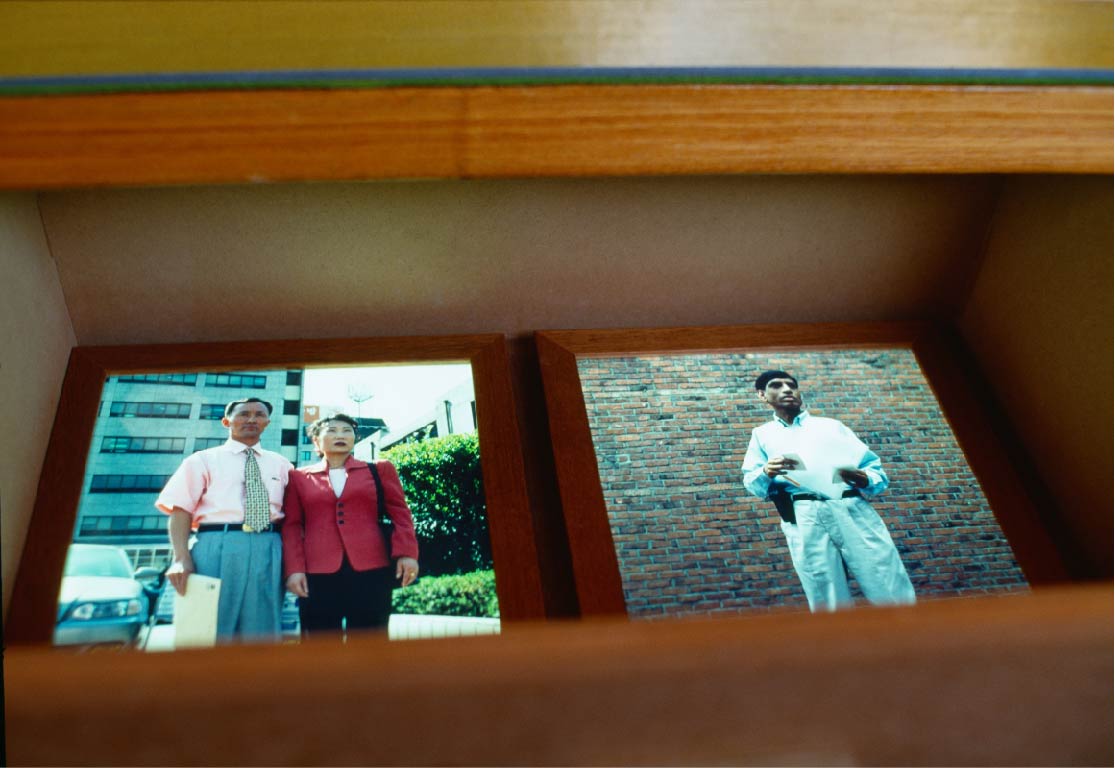 작품 설명: <이주>는 한국에서 생활하는 외국인 노동자의 현실을 다큐멘터리의 형식으로 보여주는 설치 작품이다. 책상 위의 수화기를 들면 고향에 있는 가족과 통화하는 외국인 노동자들의 목소리가 들리고, 이들이 집단으로 거주하는 숙박장소를 담은 사진도 설치되어 있다. 모니터에서는 단속반에 걸린 미등록 외국인을 면담하는 장면이 상영되고, 한국사회에서 겪는 인권문제들을 보여주는 구체적 증거자료들이 함께 전시된다. 이 자료들은 한국에서 생활하는 외국인 노동자들에게는 일상적인 것이지만 일반인들에게는 접하기 힘든 것들이다. 작가는 이 설치작품을 통해 우리에게 잘 알려지지 않은 외국인 노동자들의 상황을 있는 그대로 보여줌으로써, 우리가 살고 있는 사회의 한쪽에서 일어나고 있는 관심 밖의 일들에 대한 관심을 호소한다.
