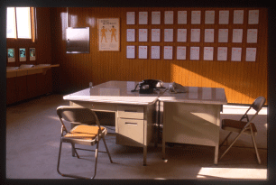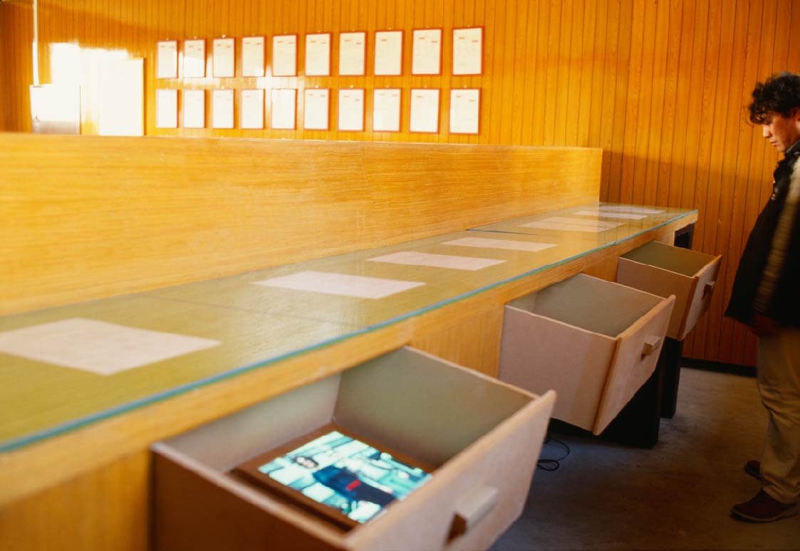 Material: Installation of 13 Light boxes, 2 DVD players, 2 TV monitors, CD player, 3 telephones, 46 Documents(counsel reports)