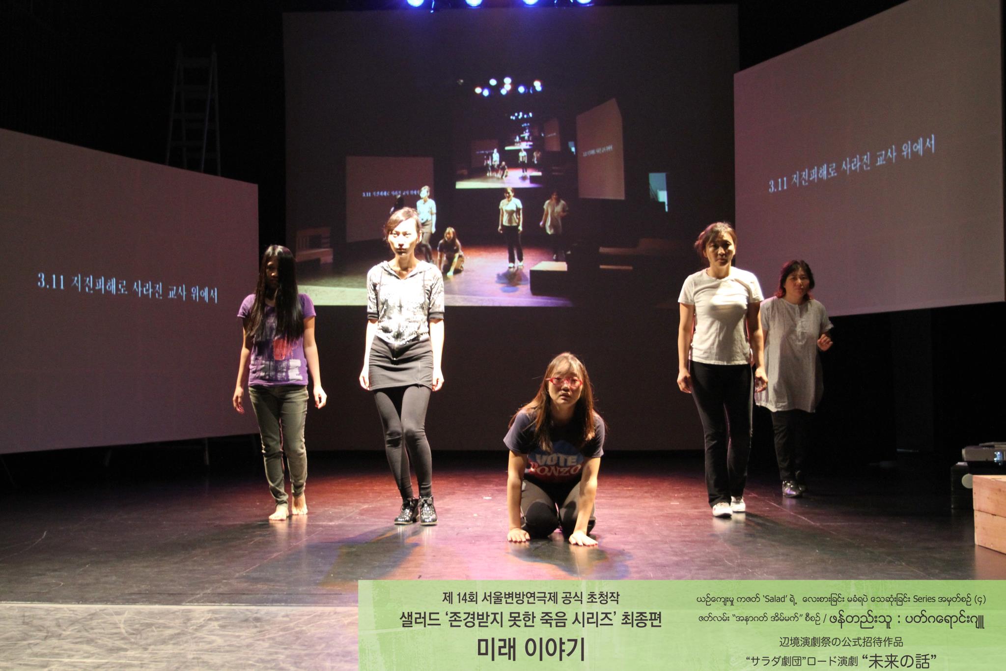 존경받지 못한 죽음 시리즈 제 4편 <미래 이야기>는 4월 25일 오후 3시 서울역에서 시작된다. 샐러드가 ‘난민’을 주제로한 창작 워크숍의 결과물로 서울역에서 가벼운 게릴라 퍼포먼스를 진행하기로 한 시점이었다. 그러나 우연히도 샐러드 단원들이 퍼포먼스를 준비하기 위해 도착한 서울역 역사 내 중앙모니터에서는 북한 혁명 80주년 기념일을 맞아 북한이 ‘3~4분내에 남한을 초토화 하겠다’는 대남 방송을 내보내고 있었다. 참여자들은 갑자기 우리 모두 ‘난민’ 이 될 수 있다는 ‘공포’에 휩싸였다. 작품의 주제가 외부에서 우리를 급습한 순간이었다. 샐러드의 퍼포먼스는 취소됐고 연극은 로드 연극으로 진행되었다. 연출자는 일본 센다이 도호쿠조선초중고급학교 학생들, 태국 메솟지역 버마민족학교 학생들, 한국 몽골학교 학생들을 만나 제2, 제3의 워크숍을 진행했다. <미래 이야기>는 제14회 서울변방연극제 초연에서 무산됐던 서울역 게릴라 퍼포먼스를 일본과 태국의 버마 난민과 함께 동시에 생중계로 진행한다. 공연에는 한국 몽골학교 학생들이 퍼포머로 참여한다. (생중계 홈페이지 언더그라운드아트채널)