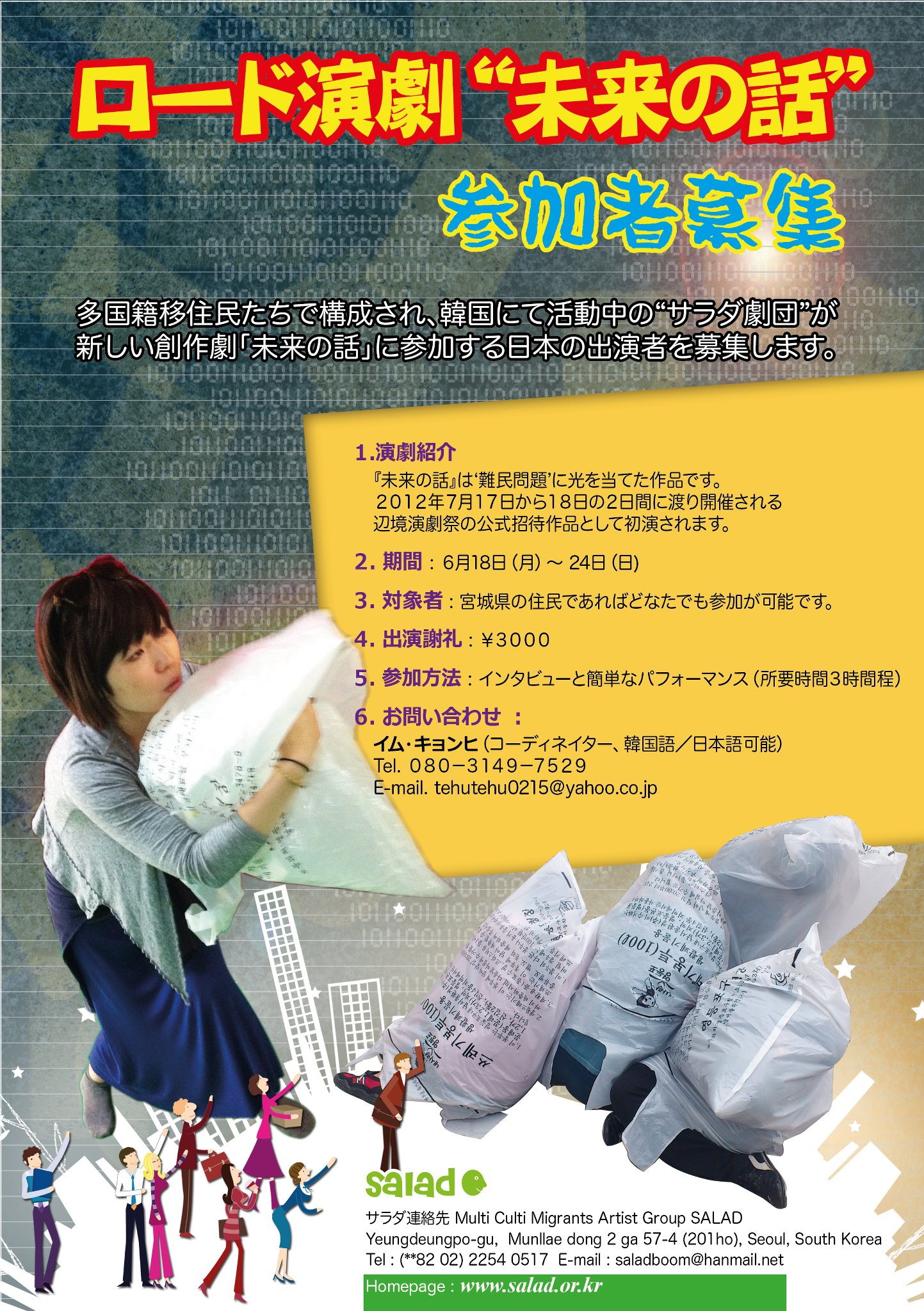 Future Story started in the Seoul station at 3 pm on April 25th. At that time, Salad planned to do guerilla performance in the Seoul station as a result of a creative workshop with a theme of ‘refugee.’ However, accidently, North Korea’s broadcasting towards the South that the military action will start within 3~4 minutes for celebrating the 80th anniversary of the national foundation was aired through the MBN news on the central TV monitor in the Seoul station when members of Salad arrived to prepare for performance. Participants suddenly felt fear that they would become refugees. The performance was canceled and the play was done in the road. The director continued the second, third, and fourth workshops with students of Tohoku Joseon School located in Sendai, Japan, Burmese Ethnic School in Maesot of Thailand, and Mongolia School in Korea. finishes as the guerilla performance canceled in the Seoul Station is shown through the Seoul Marginal Theater Festival 2012 and lively broadcasted with refugees of Japan, Thailand, and Korea.