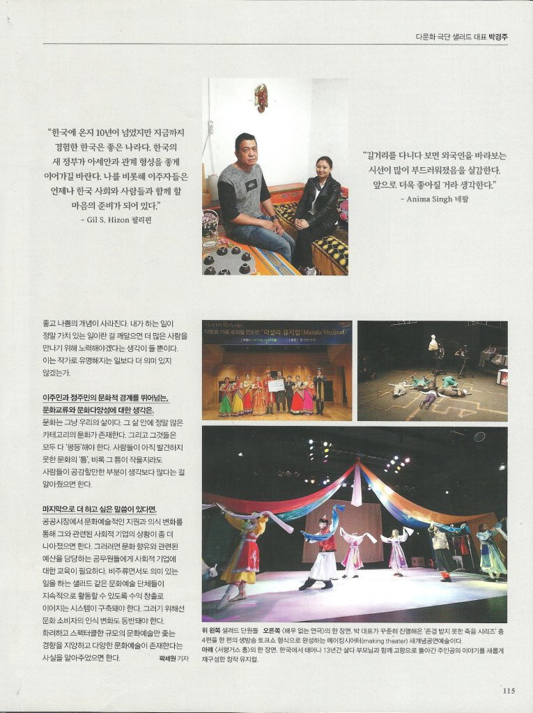 골목과 건물마다 각종 원자재가 가득 쌓여있는 서울 문래동에 어울리지 않는 공연 사무실이 있다. 바로 다국적 이주민으로 구성된 국내 첫 다문화 극단 ‘샐러드’이다. ‘다양한 문화가 함께 잘 어우러진다’는 뜻의 샐러드볼에서 이름을 따왔다는 이 극단은 어느덧 올해로 설립 11년을 맞았으며 2014년 고용노동부 인증을 받은 사회적 기업이다. 이주민 인권 문제와 그들이 겪는 고통을 문화예술로써 전하는 박경주 대표와 이제는 가족이나 다름없다는 단원들을 만나 대한민국의 다문화 이모저모를 들어보았다.