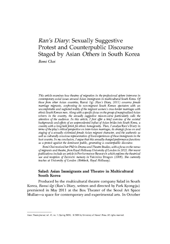 This article examines how theatres of migration in the professional sphere intervene in contemporary social issues around Asian immigrants in multicultural South Korea. Of those from other Asian countries, Ranui ilgi (Ran’s Diary, 2011) concerns female marriage migrants, confronting its non-migrant South Korean spectators with an uncomfortable and neglected reality of the migrant women’s cross-border marriages with ethnic South Korean men. Along with a specific focus on the group of marginalized Asian others in the country, the sexually suggestive mise-en-sce`ne particularly calls the attention of the audience. In this article, I first offer a brief overview of the societal backgrounds and effects of an unprecedented influx of Asian brides into South Korea, a country with a long-held fetish for ethnic homogeneity. Then, I analyze Ran’s Diary in terms of the play’s critical perspective on inter-Asian marriages, its strategic focus on and staging of a sexually victimized female Asian migrant character, and the authentic as well as culturally conscious representation of lived experiences of those immigrants in the host country. In my conclusion, I argue that this sexually-charged performance functions as a protest against the dominant public, generating a counterpublic discourse.