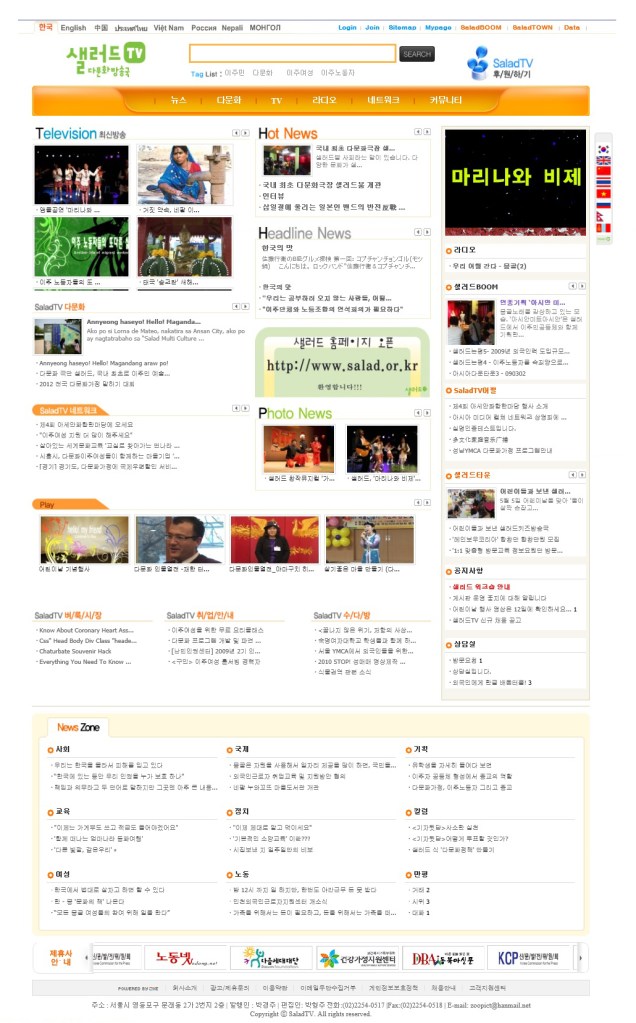 Salad TV (Founder & President: Park Kyong Ju, the name which was originally Internet Broadcast for Migrant Workers in Korea changed into Salad TV in 2009) launched on May 18th, 2005 had been run mainly by its editors and volunteer citizen journalists as an online media company without the government’s direct contribution.