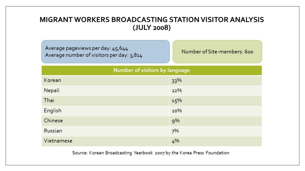 On May 18, 2005, the Korean language website Migrant Workers Broadcasting Station was opened.