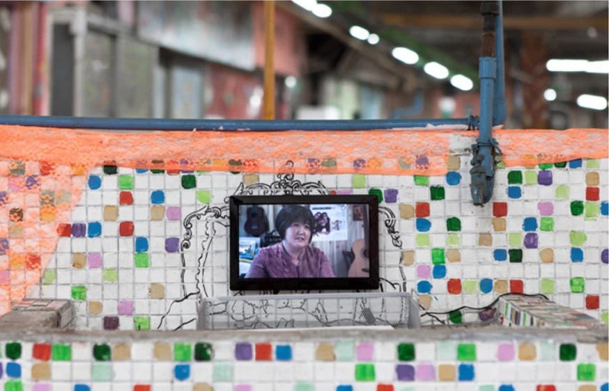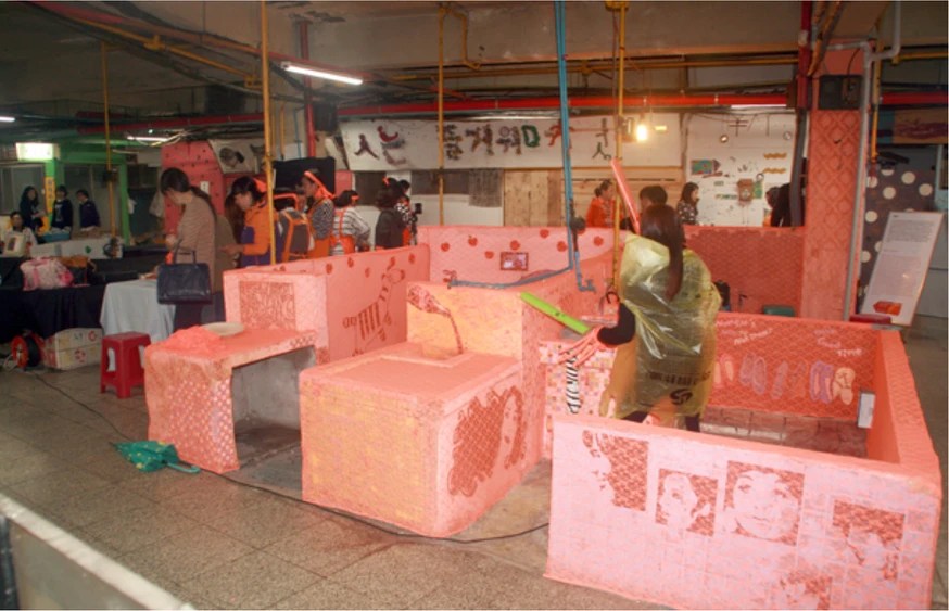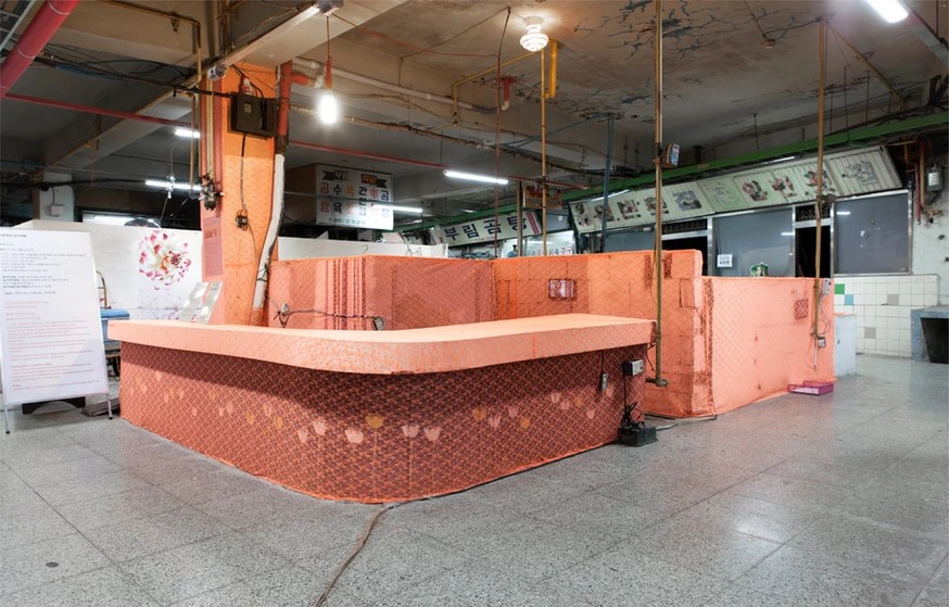 Park Kyongju decorated the empty restaurant located at the underground of Burim market with see-through textiles or materials, to give new lights on the impending issues of Changwon region. Park comes up with her own survey questions and performs stand-up interviews with Changdong Art Village artists and local residents. The restaurant decorated with see-through textiles become the exhibition venue that display these interview and survey sheets (results), and at the same time, becomes a live-show studio.