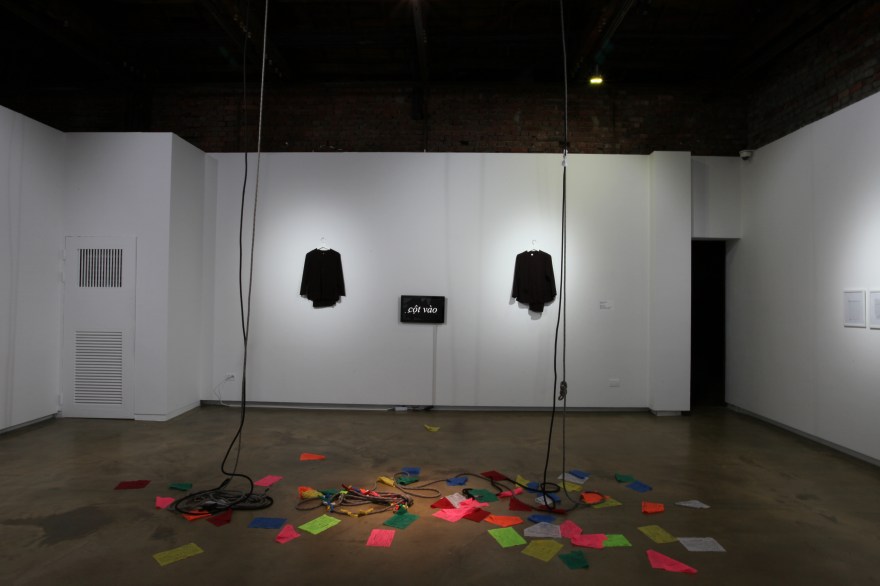 Context: Two performers take a page from the diary and perform performatively suspended in the air in the exhibition hall. For three hours, they hang in the air, do not come down, and show scenes symbolizing pages 16 and 9 of the diary without dialogue. In the single-channel video, Vietnamese words symbolizing the truth of the incident are repeatedly performed. In the case of a performance with audience participation, the audience is given the role of a diary page on the spot and must participate in the performance.