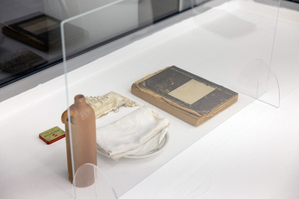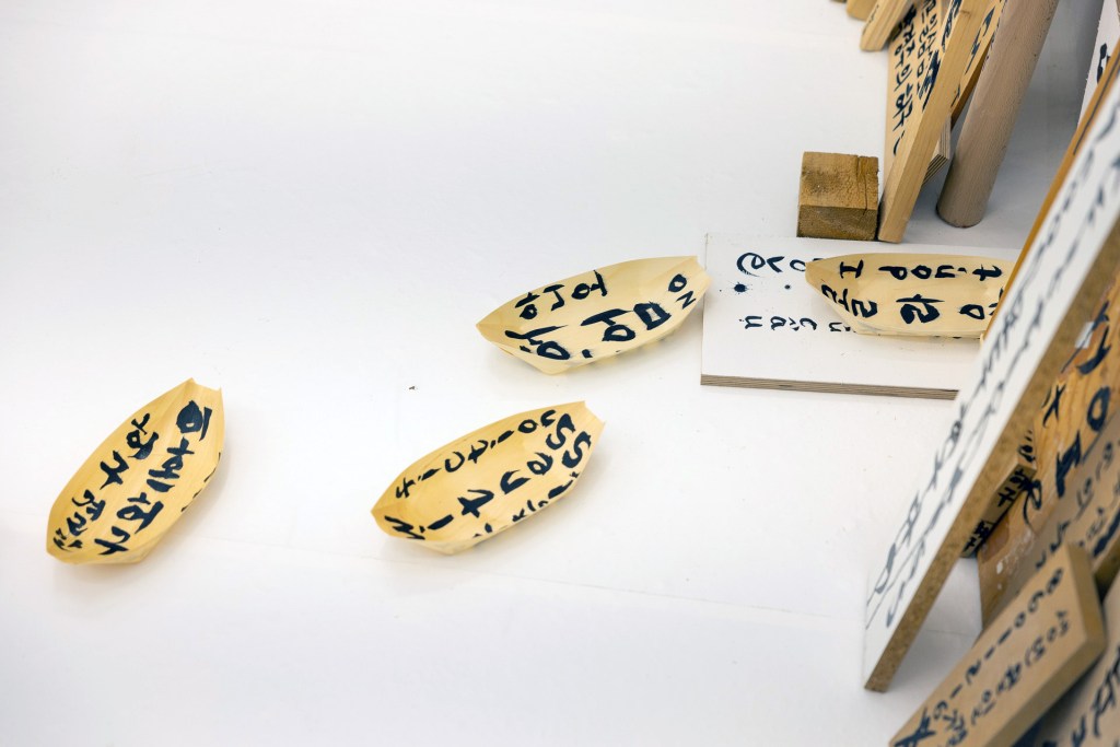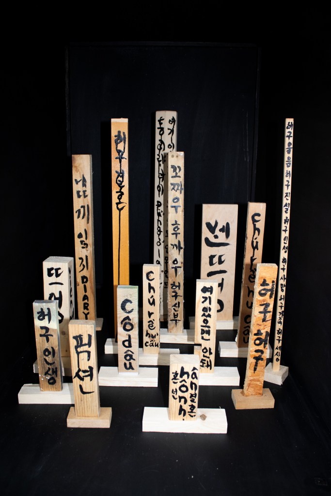 In this exhibition, artist Park Kyong Ju expresses the psychological connection between the fact that Tran Thanh Lan, a Vietnamese woman who died 26 days after entering Korea, had no alien registration number, and Park’s reality of living in Bad Ems, Germany with a fiction residence permit (Fiktionsbescheinigung, Fiction certificate). Through this exhibition, the artist intends to remind us of immigrants who live like ghosts in a strange land beyond the border. They are ghosts who are here but do not exist. The artist seeks to criticize the reality that while neoliberal capital freely crosses borders, borders are still closed to the socially disadvantaged, such as women and freelance artists. Additionally, artist Park hopes to create an opportunity to discuss what alternatives are needed for the future. This solo exhibition, ‘I am Fiction.’, consists of works newly created during the residency period in Artist Residency Schloss Balmoral. These works are being shown to the public for the first time. Artist Park, who lives as a ghost at Balmoral Castle with a fictional residence permit, drew her psychological map with calligraphic Drawings on discarded wood collected from the basement of the Artist Residency Schloss Balmoral (Work title: I Am Fiction). Park also visited the underground storage of the Museum Bad Ems and selected several artifacts that had never been shown to the public and existed as ghosts in the City Museum Bad Ems. She is showing them to the public for the first time in her solo exhibition. In exchange for borrowing the museum’s artifacts, artist Park lends her calligraphic Drawings to the museum and displays it at the City Museum Bad Ems during her solo exhibition. (Work title: Come to Fiction Ems). Park Kyong Ju draws calligraphy-style drawings with Chinese ink on discarded wood and turns them into libations, revering the writing as a spiritual entity (Work title: Ghost House).