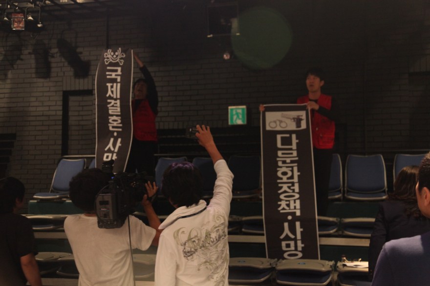 Live Experimental Theatre Made by Park Kyong Ju(www.parkkyongju.com), a New Conceptual Artist, with Multicultural People’Theater without Actor’ is an experimental theater selected by Hanguk Performing Arts Center as a special performance in part of interdisciplinary arts of a new concept performance art series, which covers a multicultural discourse through a live talk show. It is a kind of a ‘making theater’ that total four theatres of ‘the Series of Unrespected Death’ created by Park Kyong Ju based on real stories that she had covered while managing Salad TV, a multicultural broadcasting system, and performed by the Theatre Salad(www.salad.or.kr)